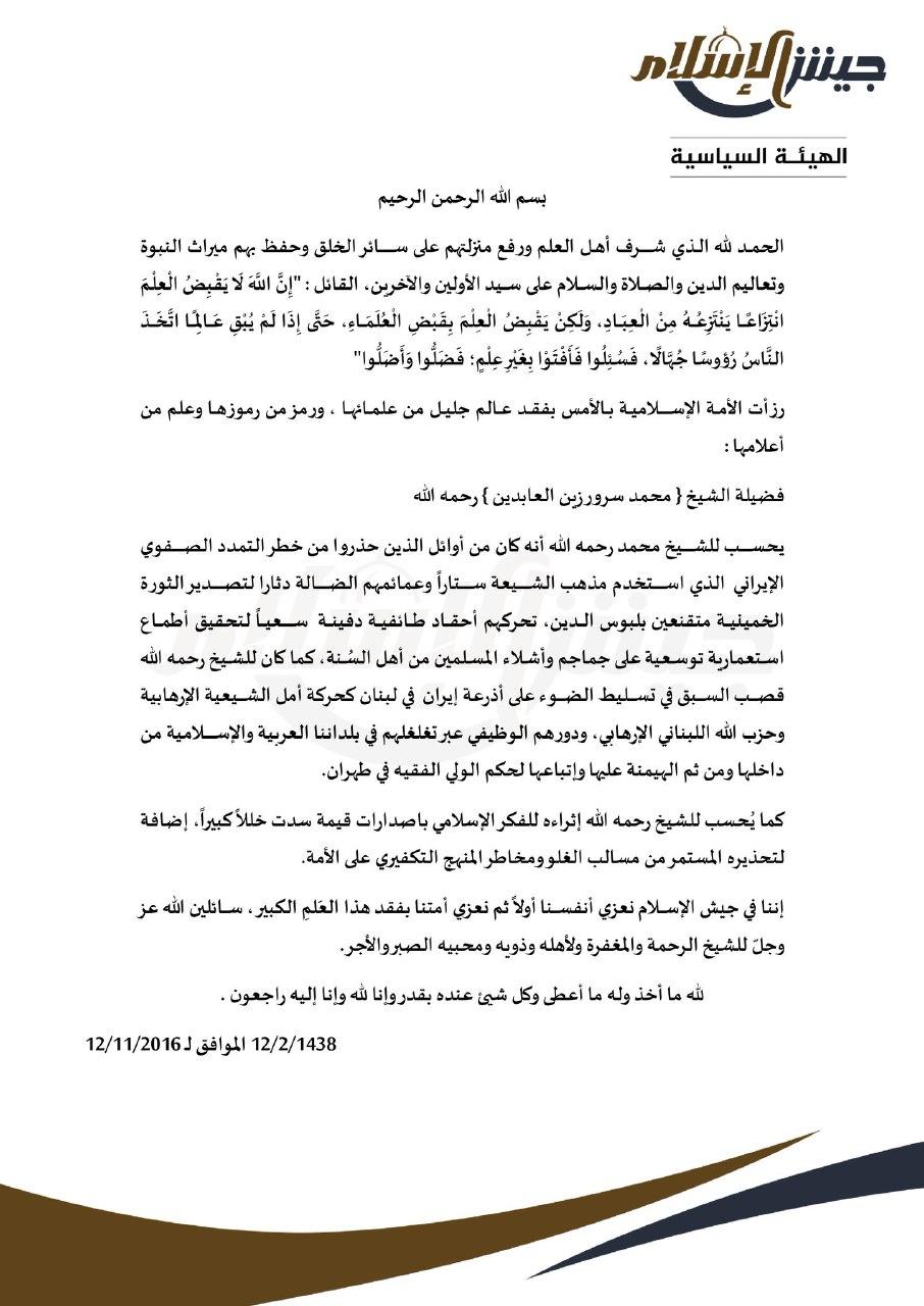 بيان تعزية من جيش الإسلام بوفاة الشيخ محمد سرور زين العابدين رحمه الله
