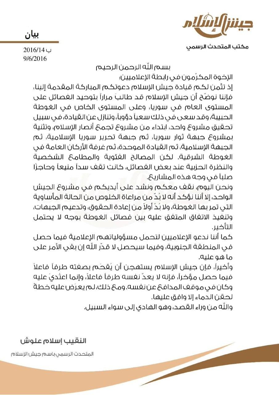بيان من المتحدث الرسمي باسم جيش الإسلام حول البيان الموجه إليه من قبل رابطة الإعلاميين