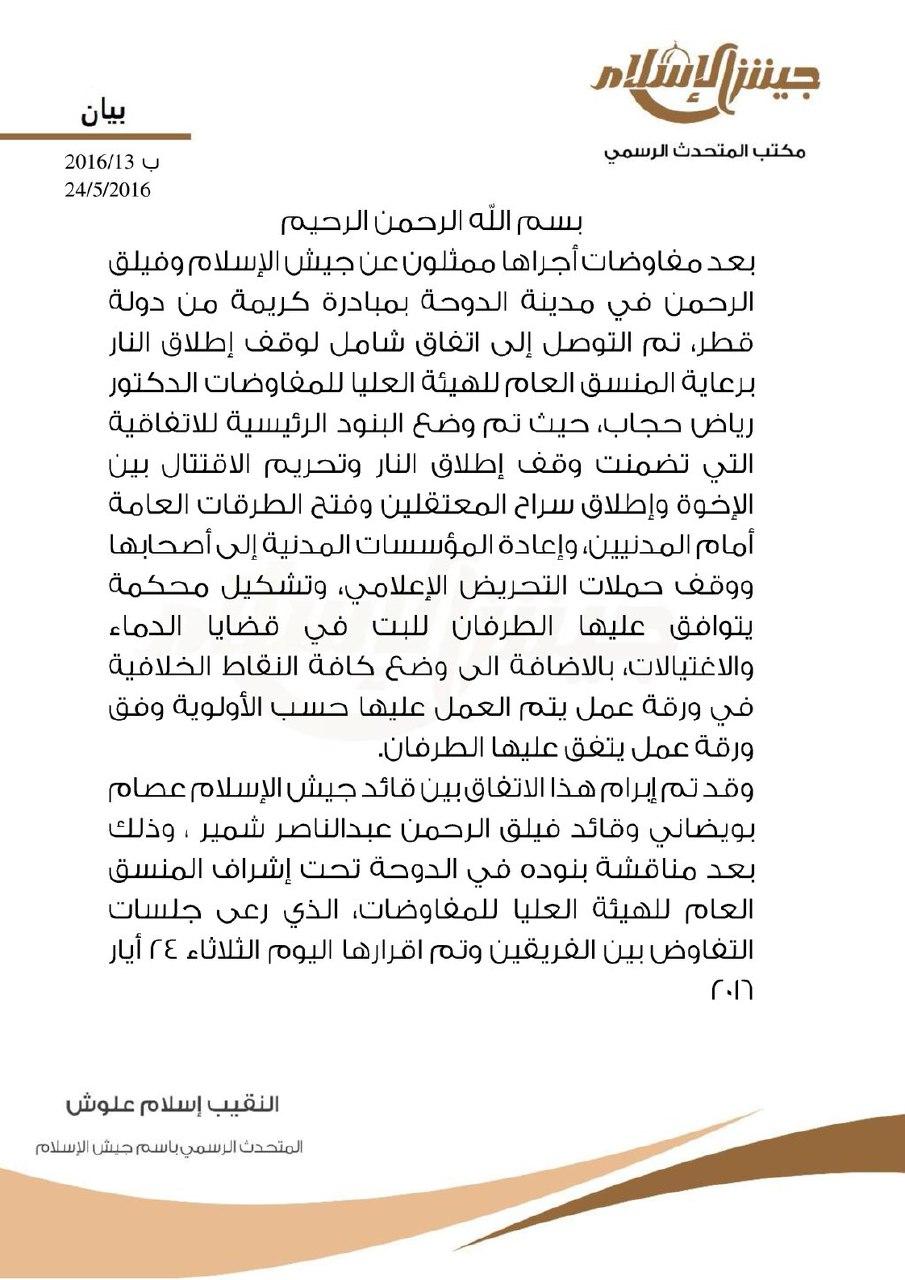 بيان من المتحدث الرسمي باسم جيش الإسلام حول الإتفاق الذي تم التوصل إليه في الدوحة بين الممثلين عن جيش الإسلام وفيلق الرحمن بمبادرة من دولة قطر وبرعاية رياض حجاب