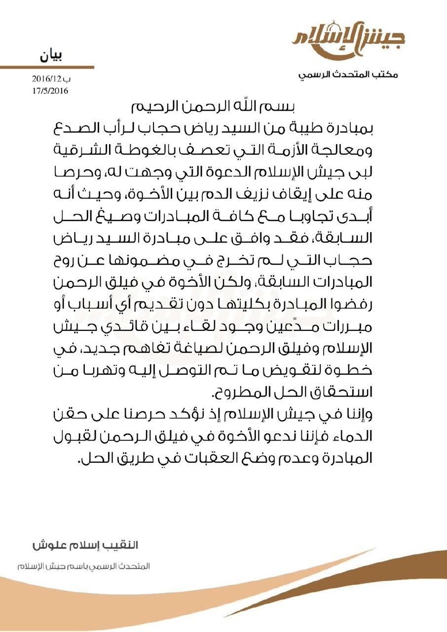 بيان جيش الإسلام للموافقة على المبادرة المقدمة من الدكتور رياض حجاب ودعوة فيلق الرحمن للموافقة عليها