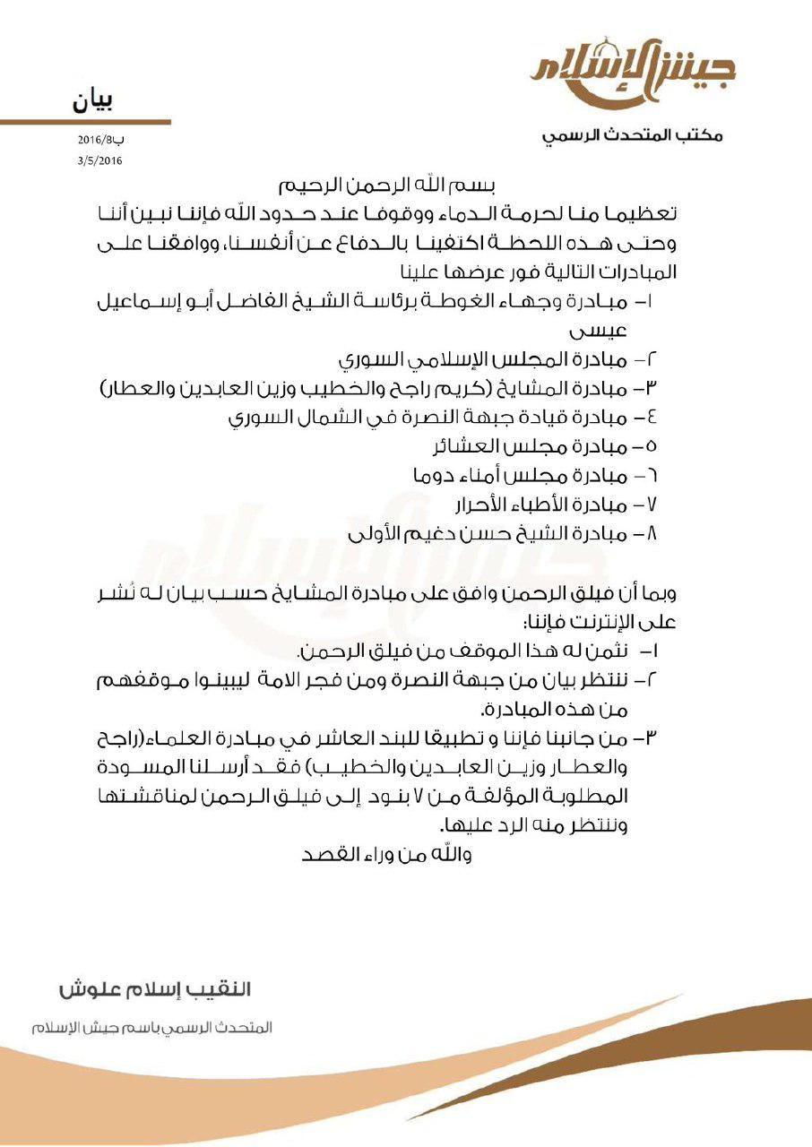 بيان من المتحدث باسم جيش الإسلام يؤكد فيه موافقته على كافة المبادرات المقدمة للحل في الغوطة ويدعو فيلق الرحمن لذلك