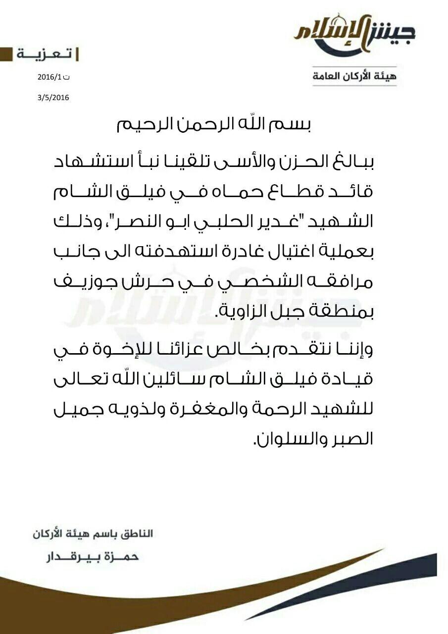 جيش الإسلام يعزي فيلق الشام بالقائد الميداني ( غدير الحلبي أبو النصر ) بعملية اغتيال في جبل الزاوية