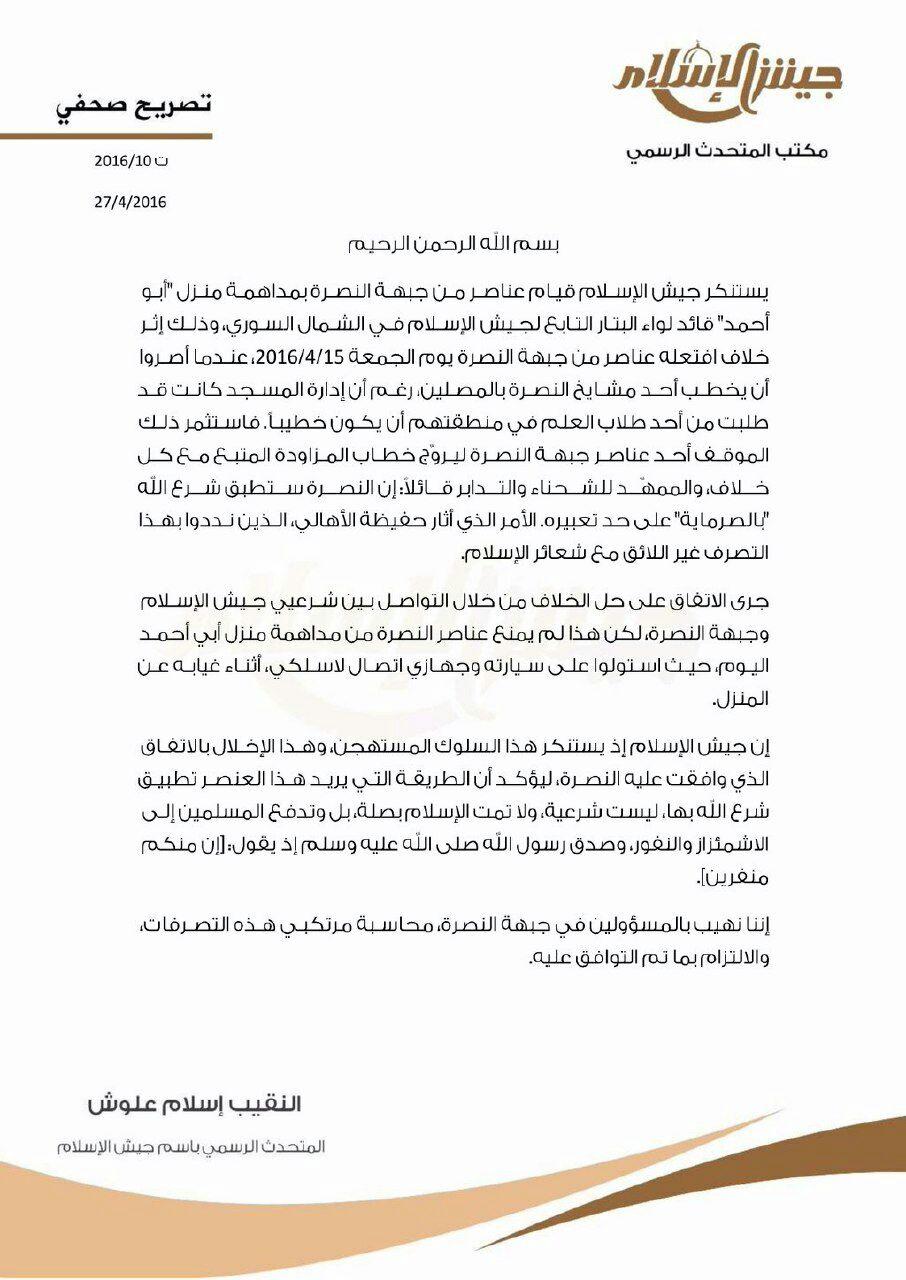 جيش الإسلام يدين مداهمة جبهة النصرة في الشمال لمنزل قائد لواء البتار التابع للجيش في الشمال السوري