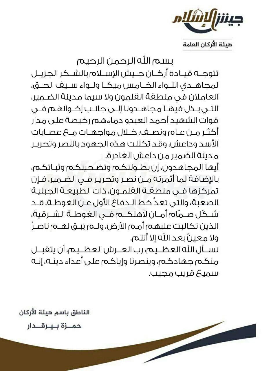 جيش الإسلام يشكر اللواء الخامس ميكا ولواء سيف الحق العاملان في القلمون مساهمتهما بتحرير مدينة الضمير من تنظيم الدولة