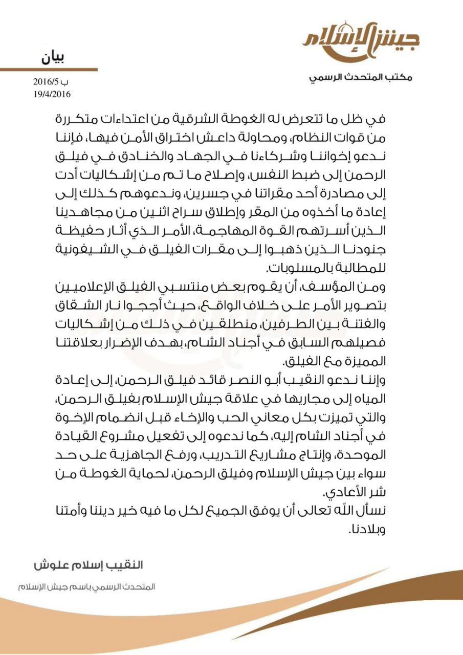بيان من جيش الإسلام حول مصادرة أحد مقاره في جسرين من قبل فيلق الرحمن ويطالب قائد الفيلق بإعادة العلاقات الطيبة التي كانت بين الفيلق والجيش