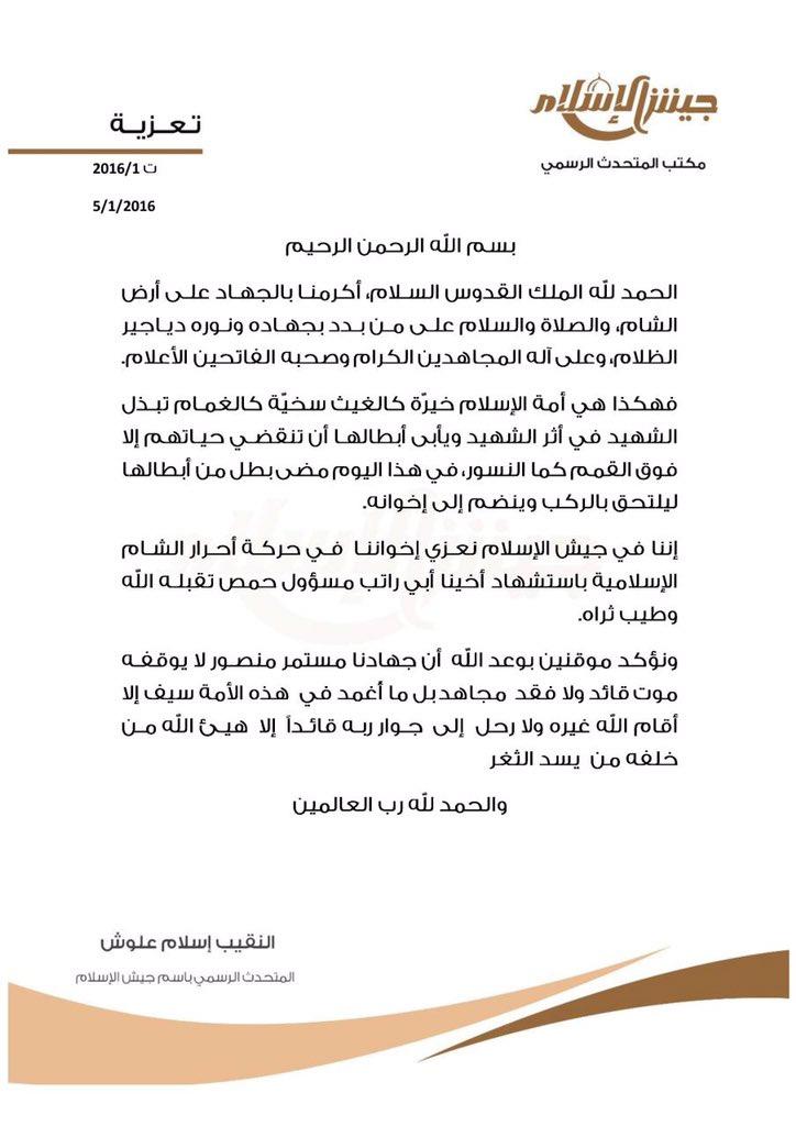جيش الإسلام يعزي حركة أحرار الشام بمسؤول قطاع حمص أبو راتب