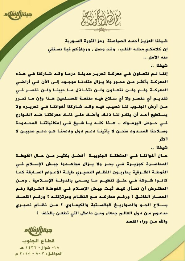 بيان للإخوة في درعا والشيخ الصياصنة صادر عن قيادة جيش الإسلام في الجنوب