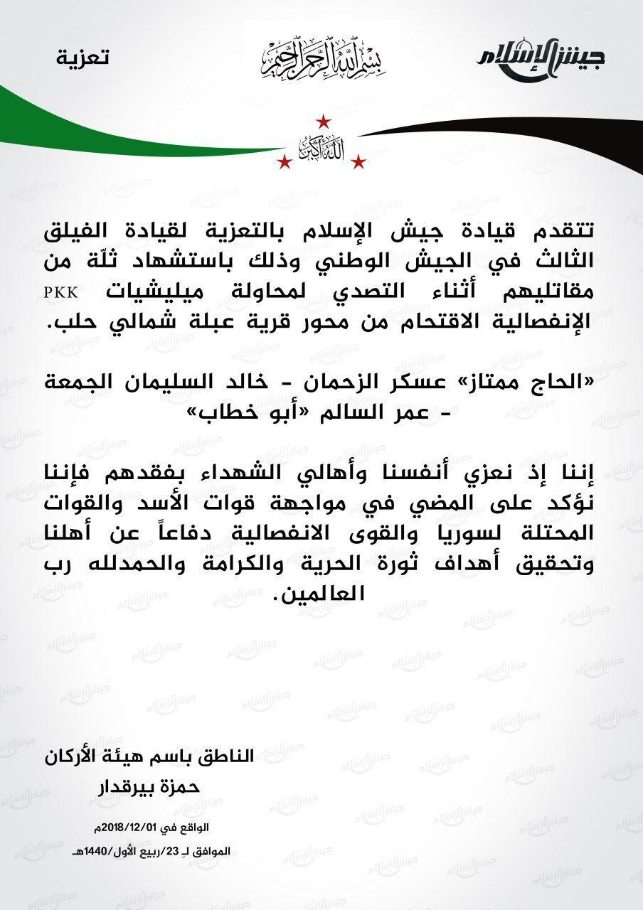 جيش الإسلام يعزي الفيلق الثالث التابع للجيش الوطني بمجموعة من مقاتليه بمعارك ضد قوات قسد بريف حلب الشمالي