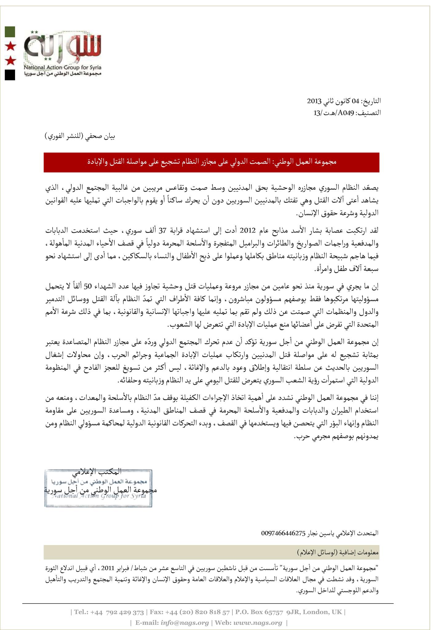 إن مجموعة العمل الوطني من أجل سورية تؤكد أن عدم تحرك المجتمع الدولي وردّه على مجازر النظام المتصاعدة يعتبر بمثابة تشجيع له على مواصلة قتل المدنيين وارتكاب عمليات الإبادة الجماعية وجرائم الحرب، وإن محاولات إشغال السوريين بالحديث عن سلطة انتقالية وإطلاق وعود بالدعم والإغاثة، ليس أكثر من تسويغ للعجز الفادح في المنظومة الدولية التي استمرأت رؤية الشعب السوري يتعرض للقتل اليومي على يد النظام وزبانيته وحلفائه.