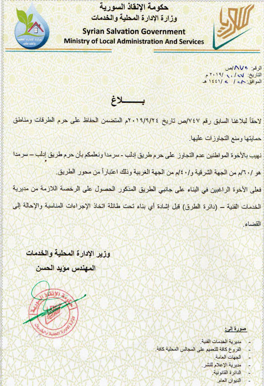 بلاغ إلى الإهالي للحفاظ على حرم الطريق الوصل بين مدينتي إدلب وسرمدا