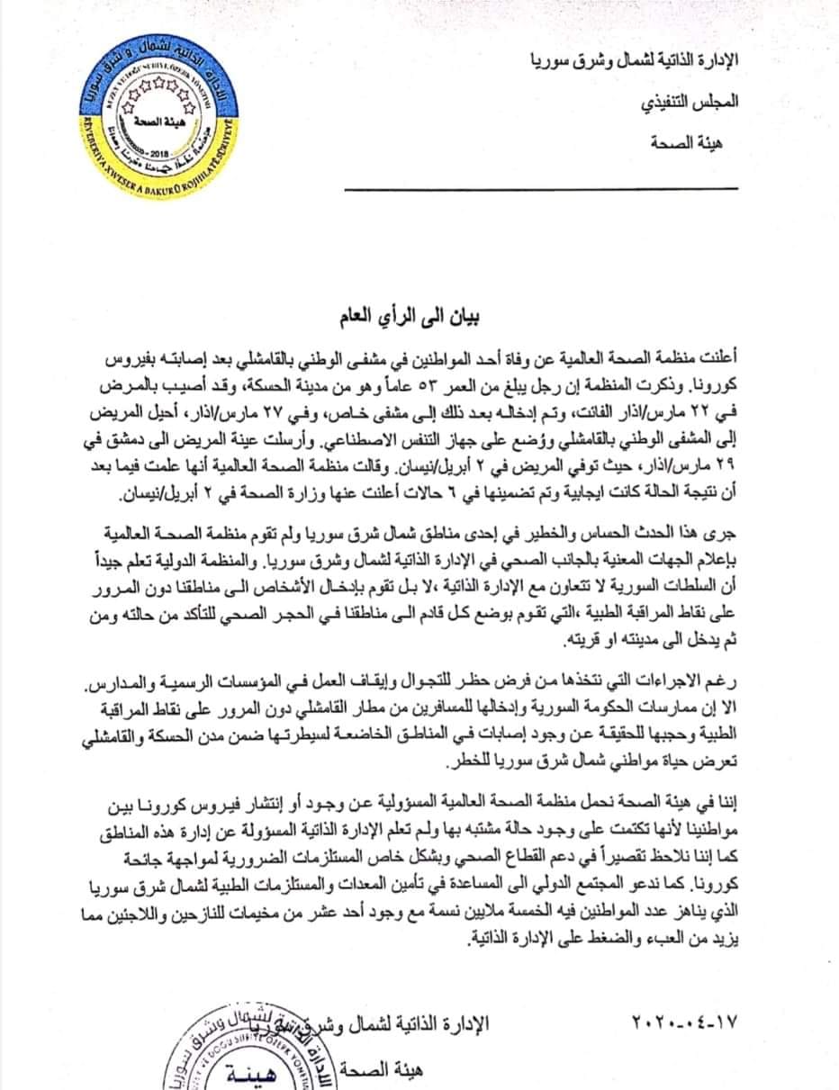 بيان الإدارة الذاتية لتحميل منظمة الصحة العالمية مسؤولية انتشار وباء كورونا في مناطقها لتكتمها عن وجود الحالات