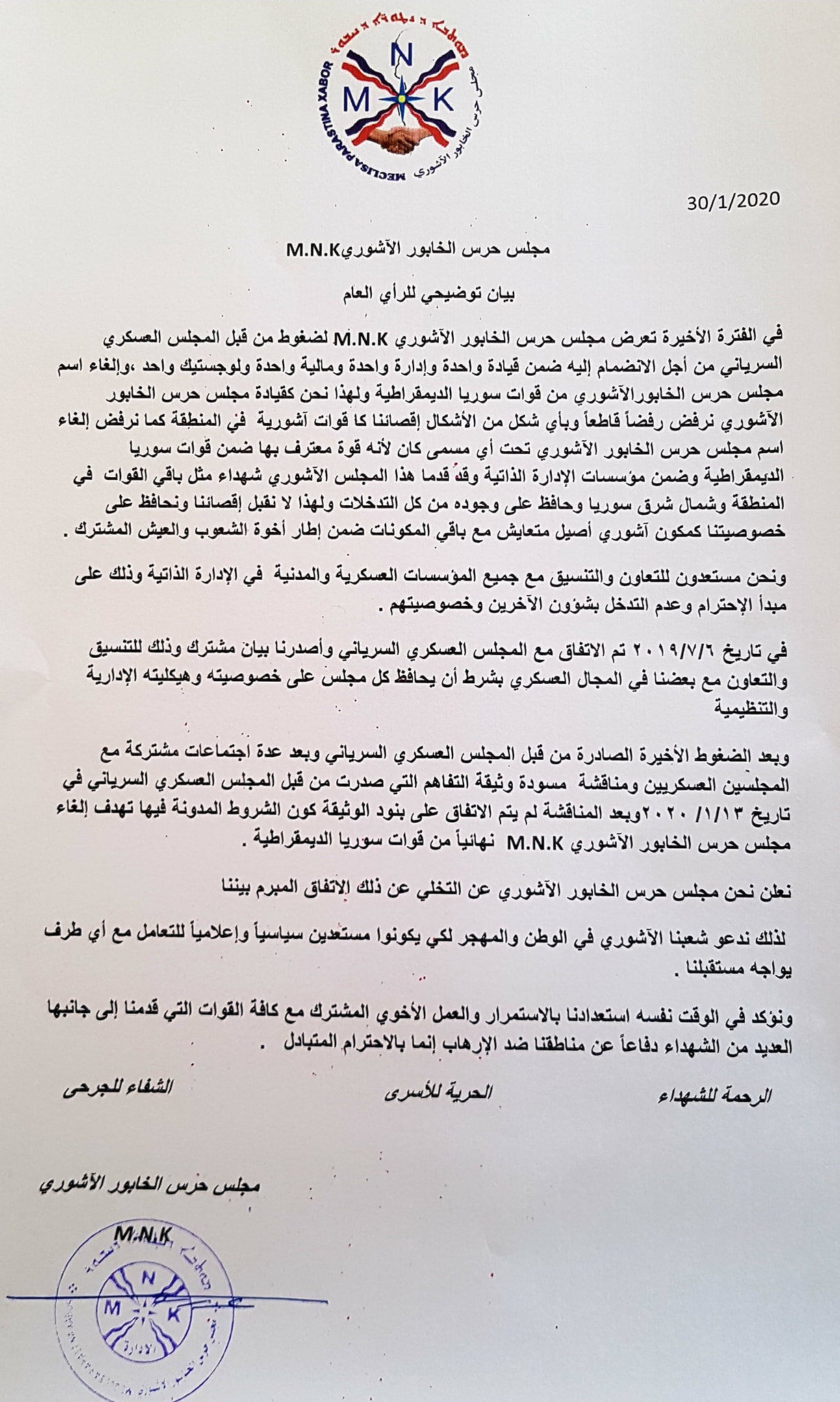 بيان من مجلس حرس الخابور الآشوري حول إلغاء الاتفاق مع المجلس العسكري السرياني بعد تعرضه لضغوط