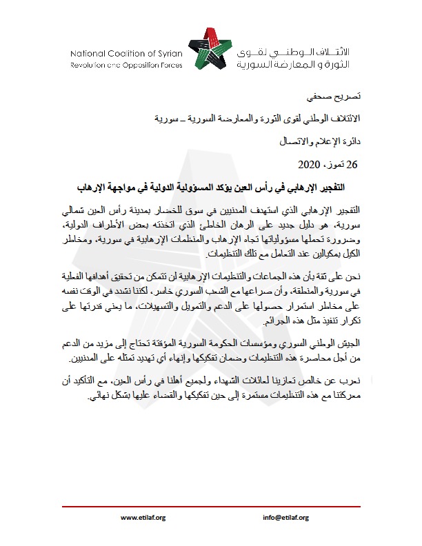 التفجير الإرهابي الذي استهدف المدنيين في سوق للخضار بمدينة رأس العين شمالي سورية، هو دليل جديد على الرهان الخاطئ الذي اتخذته بعض الأطراف الدولية، وضرورة تحملها مسؤولياتها تجاه الإرهاب والمنظمات الإرهابية في سورية، ومخاطر الكيل بمكيالين عند التعامل مع تلك التنظيمات.
