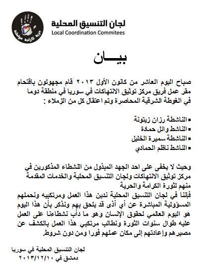 صباح اليوم العاشر من كانون الأول 2013 قام مجهولون باقتحام مقر عمل فريق مركز توثيق الانتهاكات في سوريا في منطقة دوما في الغوطة الشرقية المحاصرة وتم اعتقال كل من الزملاء