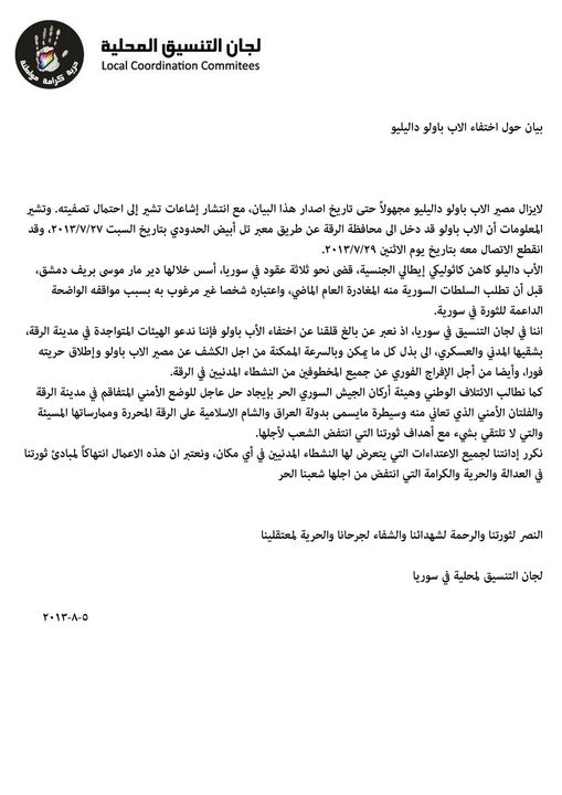 اننا في لجان التنسيق في سوريا، اذ نعبر عن بالغ قلقنا عن اختفاء الأب باولو فإننا ندعو الهيئات المتواجدة في مدينة الرقة، بشقيها المدني والعسكري، الى بذل كل ما يمكن وبالسرعة الممكنة من اجل الكشف عن مصير الاب باولو وإطلاق حريته فورا، وأيضا من أجل الإفراج الفوري عن جميع المخطوفين من النشطاء المدنيين في الرقة.