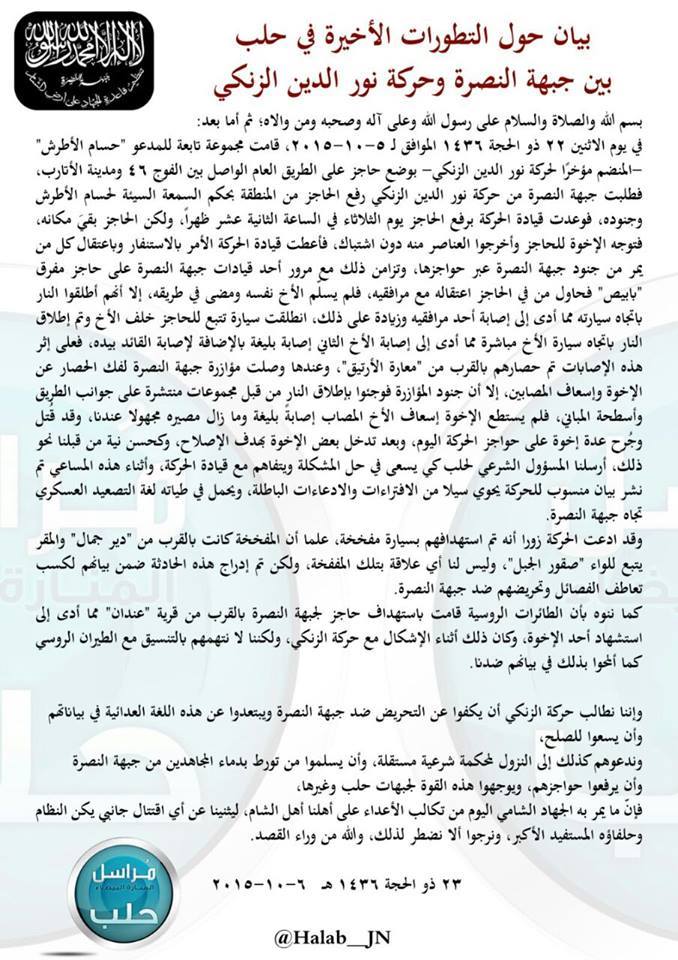 يان صادر عن جبهة النصرة بخصوص التطورات الأخيرة بينها و بين حركة نور الدين الزنكي بريف حلب الغربي
