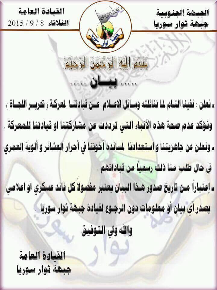 بيان جبهة ثوار سوريا حول نفي قيادتها لمعركة تحرير اللجاة