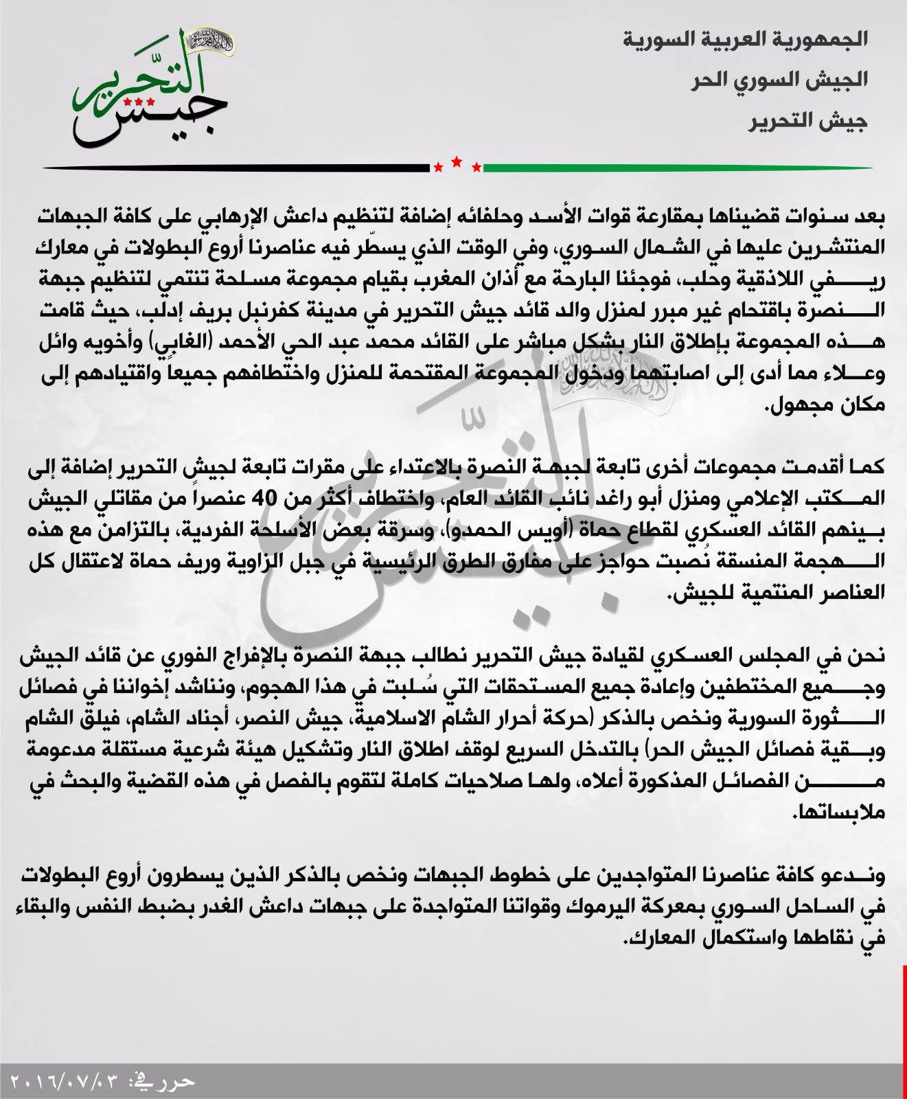 بيان صادر عن جيش التحرير بخصوص الاعتداء عليه من قبل جبهة النصرة