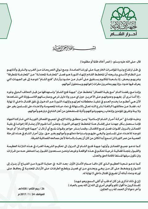 قرار صادر من حركة أحرار الشام بالنزول كقوات فصل لمنع الاقتتال بين جبهة فتح الشام وبقية الفصائل