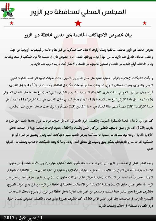 بيان المجلس المحلي لمحافظة دير الزور حول الانتهاكات الحاصلة بحق المدنيين في المحافظة