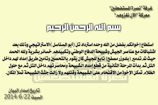 بيان السيطرة على تل أبو السناسل الاستراتيجي بالقرب من قرية جبورين ضمن معركة الآن نغزوهم