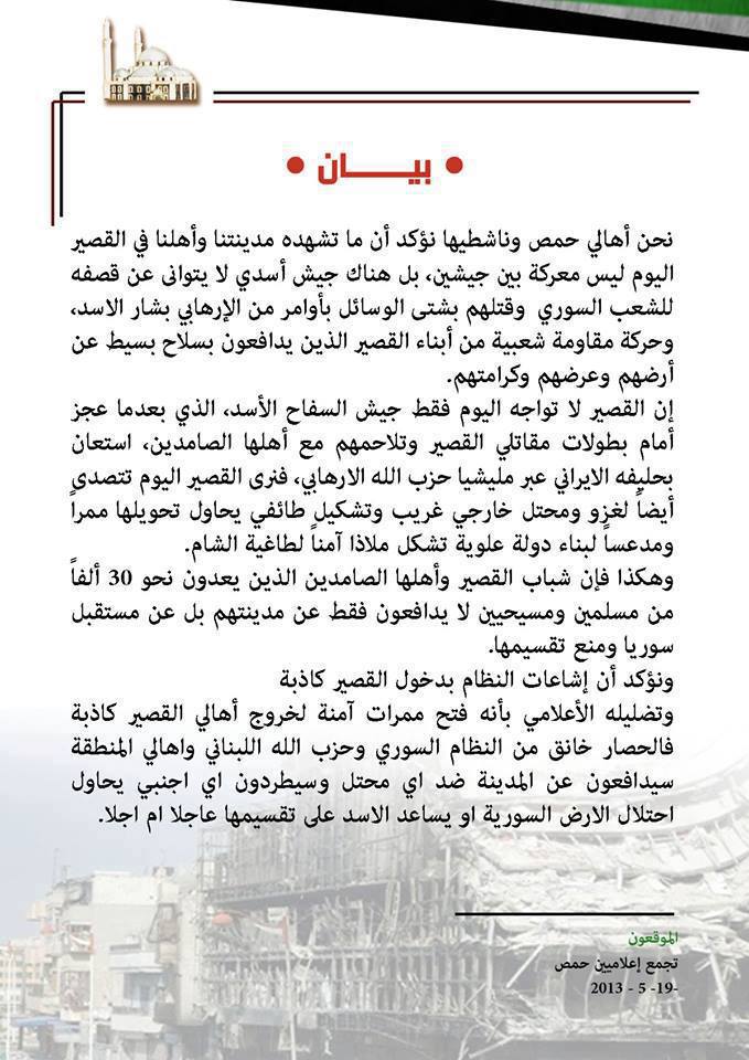 بيان من داخل القصير: المعركة مستمرة، وصامدون هناك، وستكون القصير مقبرتكم أيها الطائفيون