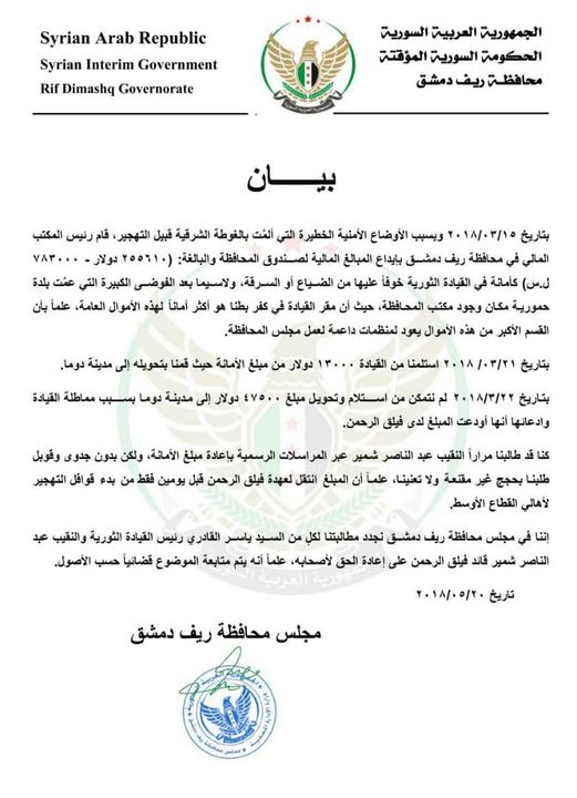 مجلس محافظة ريف دمشق يطالب كلاً من ياسر القادري رئيس القيادة الثورية والنقيب عبد الناصر شمير قائد فيلق الرحمن بإعادة المبلغ الذي تم إيداعه عندهم ويتهمهم بالمماطلة وسرقة المبلغ