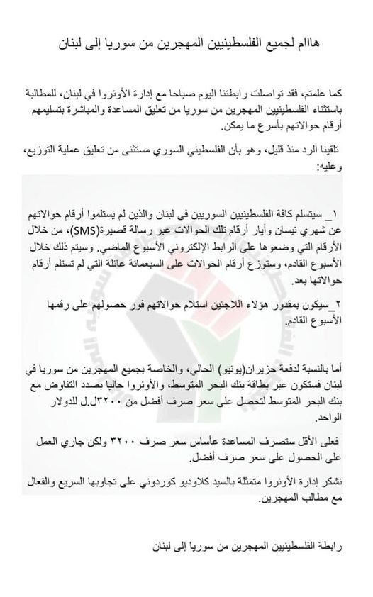 بيان من رابطة المهجرين الفلسطينيين من سوريا إلى لبنان حول استلام الفلسطينيين المهجرين مستحقاتهم المالية عن طريق الأونروا