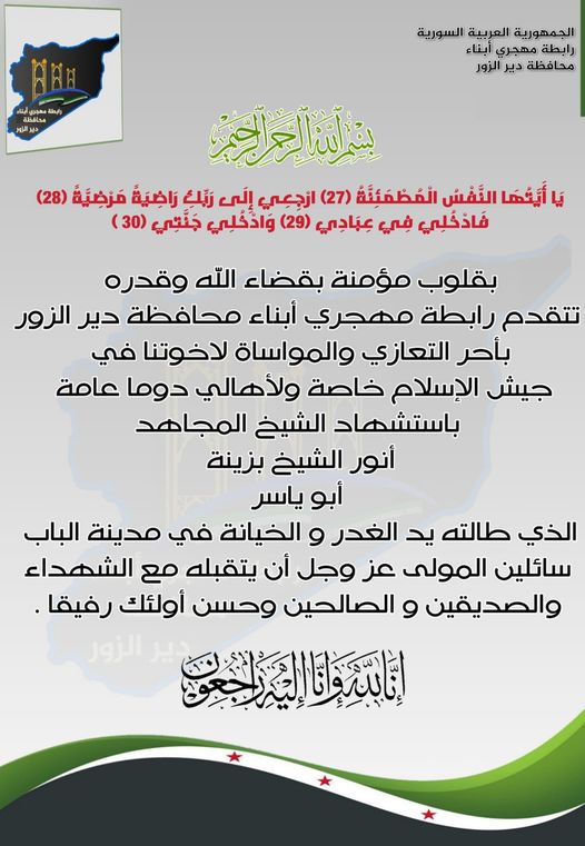 رابطة أبناء مدينة ديرالزور في الباب تعزي جيش الإسلام بالشيخ أنور الشيخ بزينة