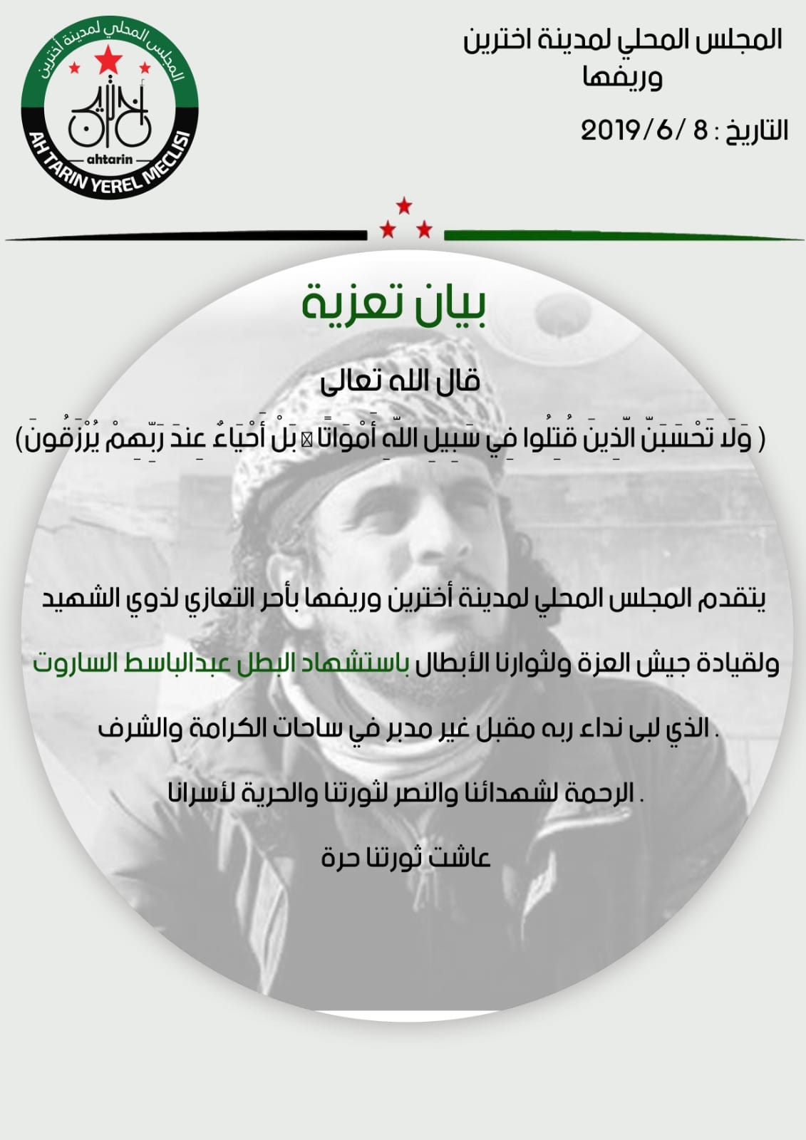 بيان تعزية بالبطل عبد الباسط الساروت