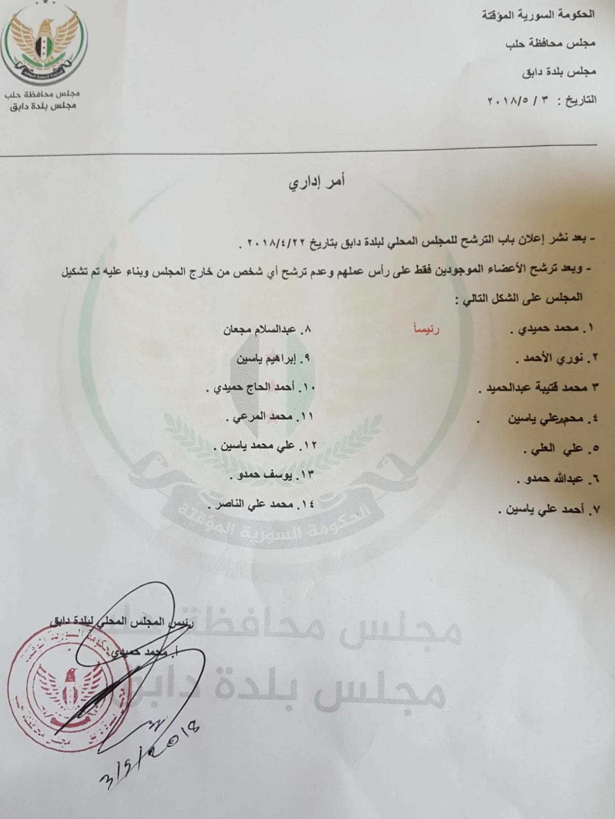 أمر إداري صادر عن المجلس المحلي في دابق حول إعادة تشكيل المجلس بعد الإنتخابات