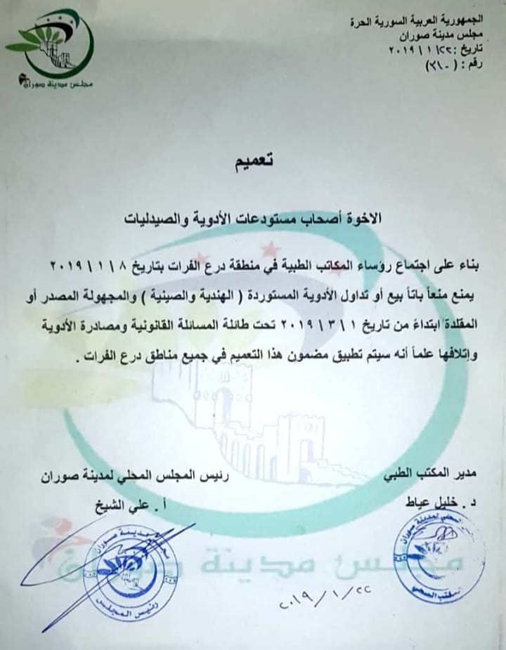 تعميم من المجلس المحلي لمدينة صوران إلى أصحاب مستودعات الأدوية والصيدليات بمنع بيع أو تداول الأدوية المستوردة أو مجهولة المصدر