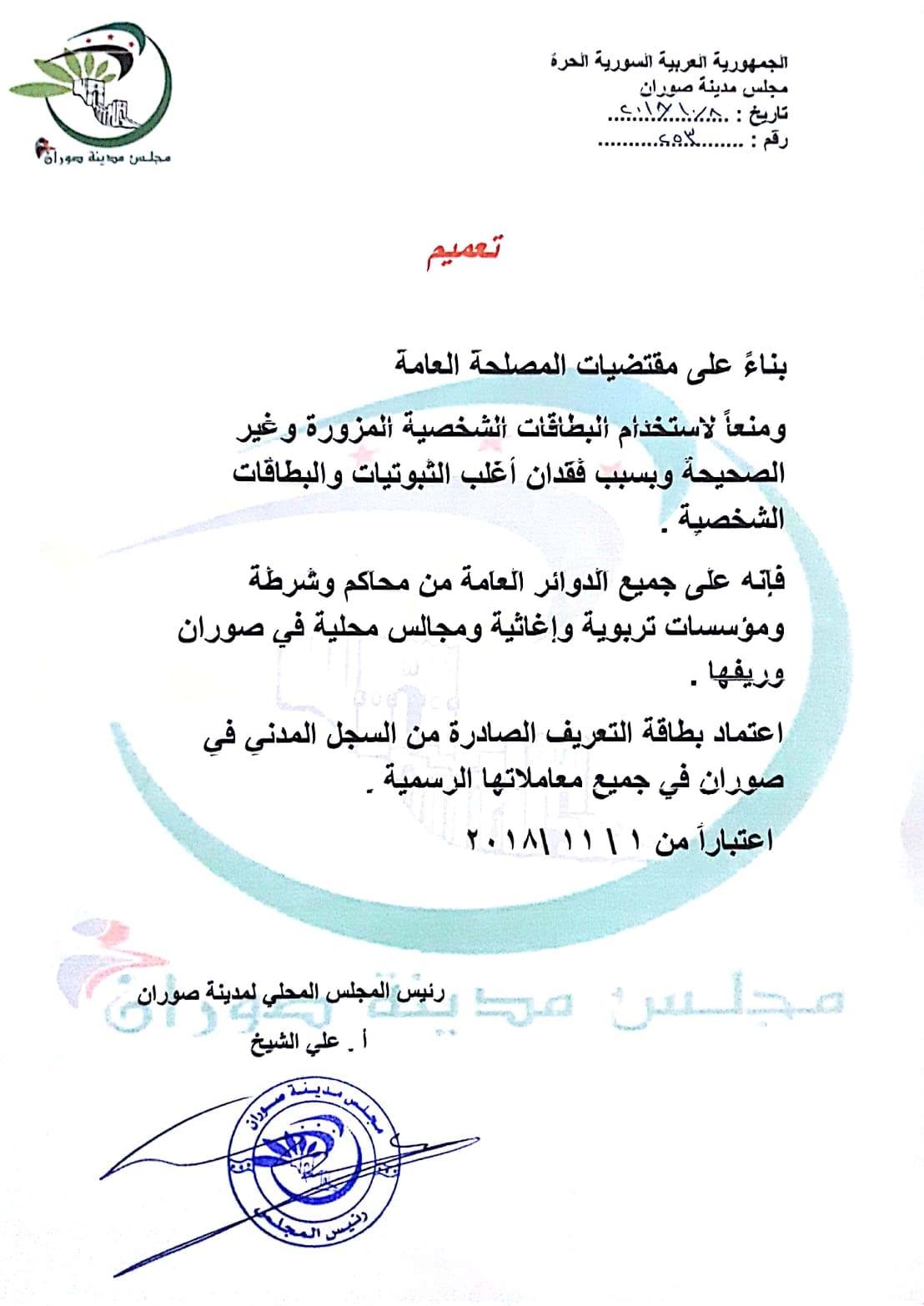 تعميم من المجلس المحلي لمدينة صوران باعتماد البطاقة التعريفية الصادرة عن السجل المدني في صوران