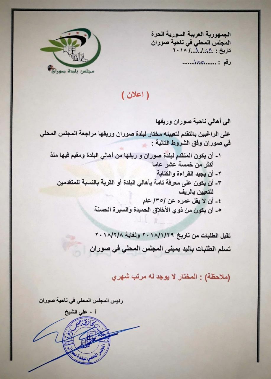 تعميم إلى أهالي ناحية صوران وريفها الراغبين بالتقدم لتعينيه مختار لبلدة صوران وريفها مراجعة المجلس المحلي