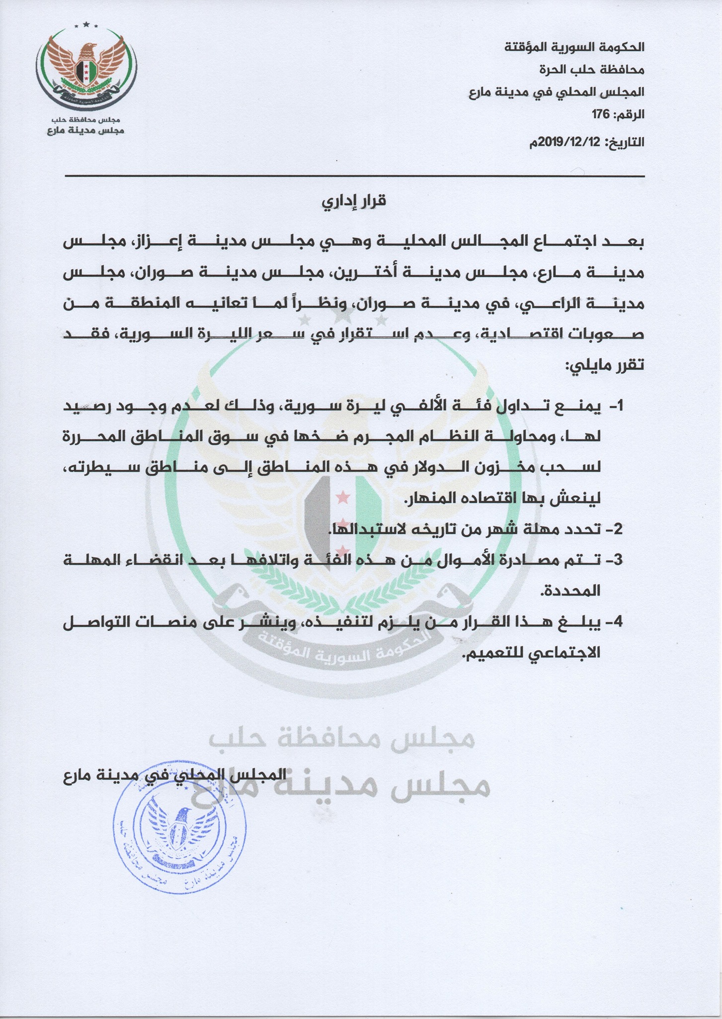 بعد اجتماع المجالس المحلية وهي مجلس مدينة إعزاز، مجلس مدينة مارع، مجلس مدينة أخترين، مجلس مدينة صوران، مجلس مدينة الراعي، في مدينة صوران، ونظراً لما تعانيه المنطقة من صعوبات اقتصادية، وعدم استقرار في سعر الليرة السورية، فقد تقرر مايلي: