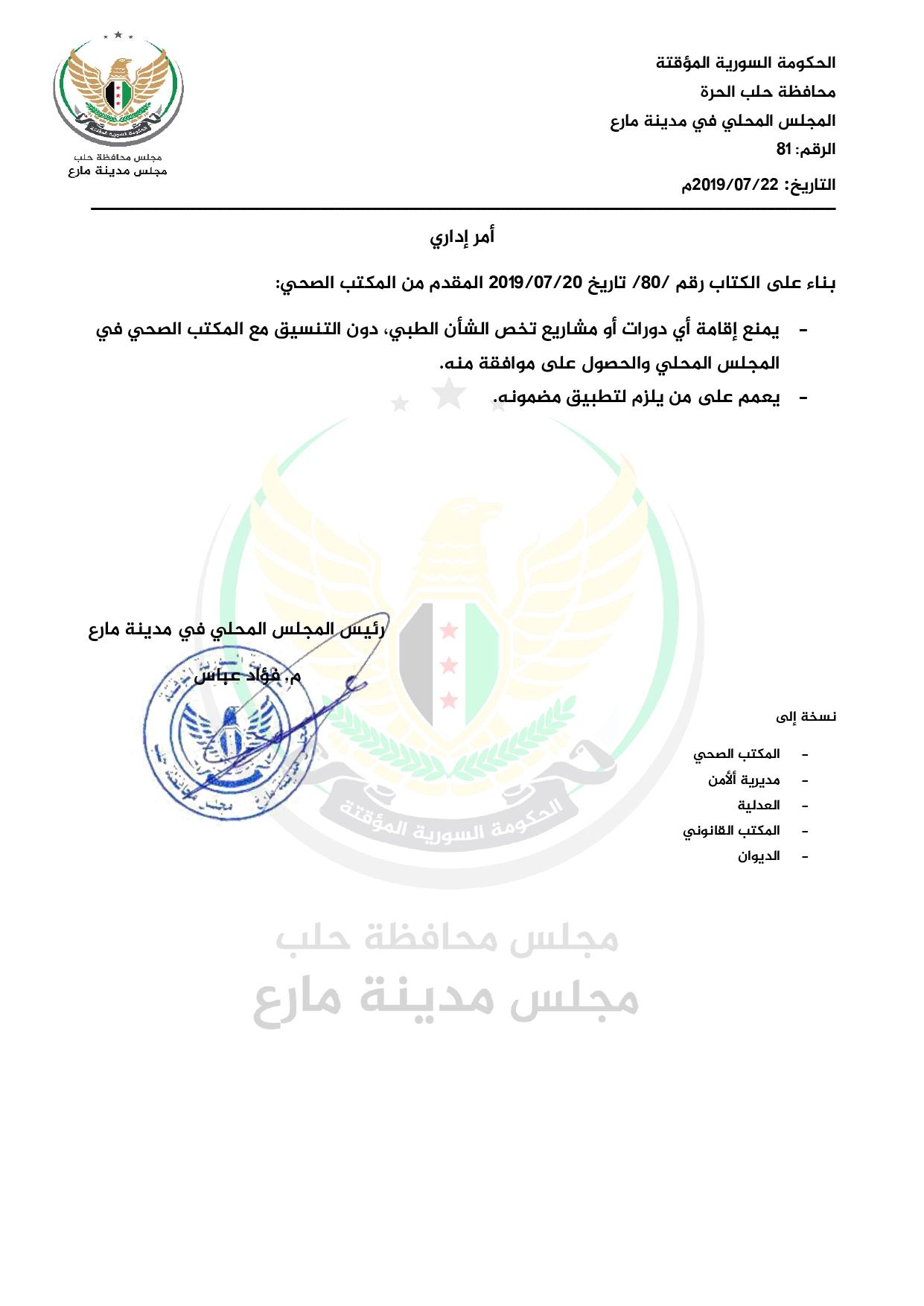 قرار من المجلس المحلي في مدينة مارع بمنع إقامة أي دورات أو مشاريع تخص الشأن الطبي دون التنسيق مع المكتب الصحي