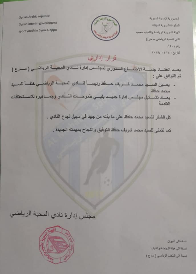 قرار إداري بتعيين محمد شريف حافظ رئيساً لنادي المحبة الرياضي في مارع