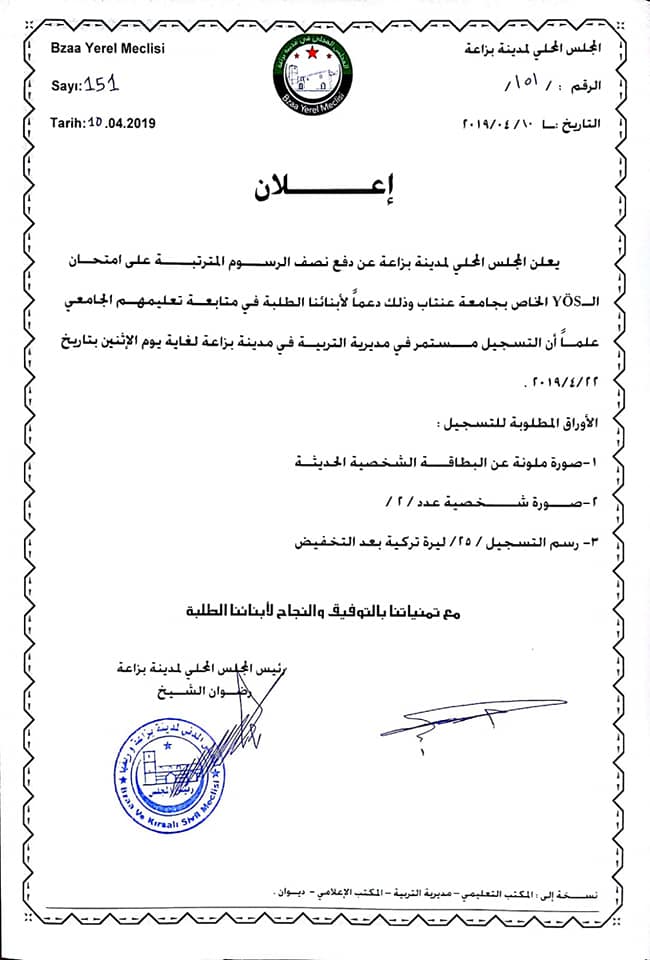 إعلان من المجلس المحلي لمدينة بزاعة بتسديده نصف رسوم امتحان يوس جامعة غازي عنتاب