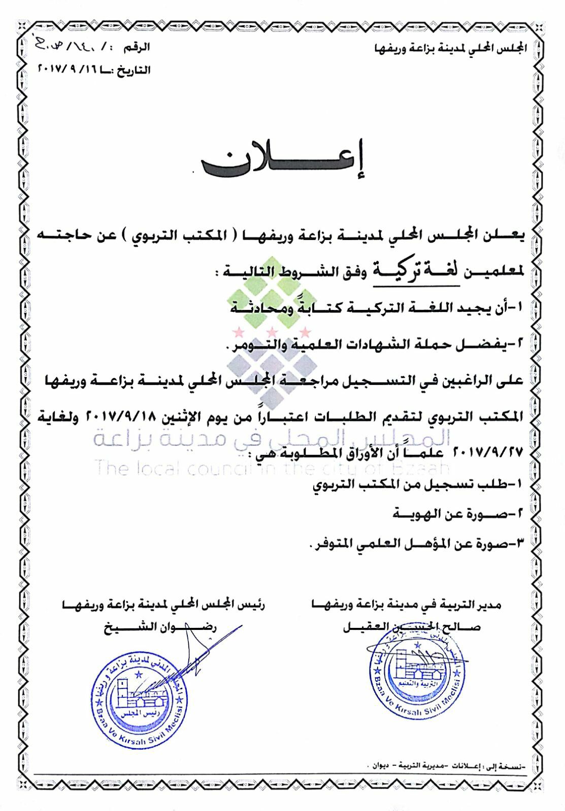 إعلان مديرية التربية و التعليم في مدينة بزاعة و ريفها طلب معلمين لغة تركية