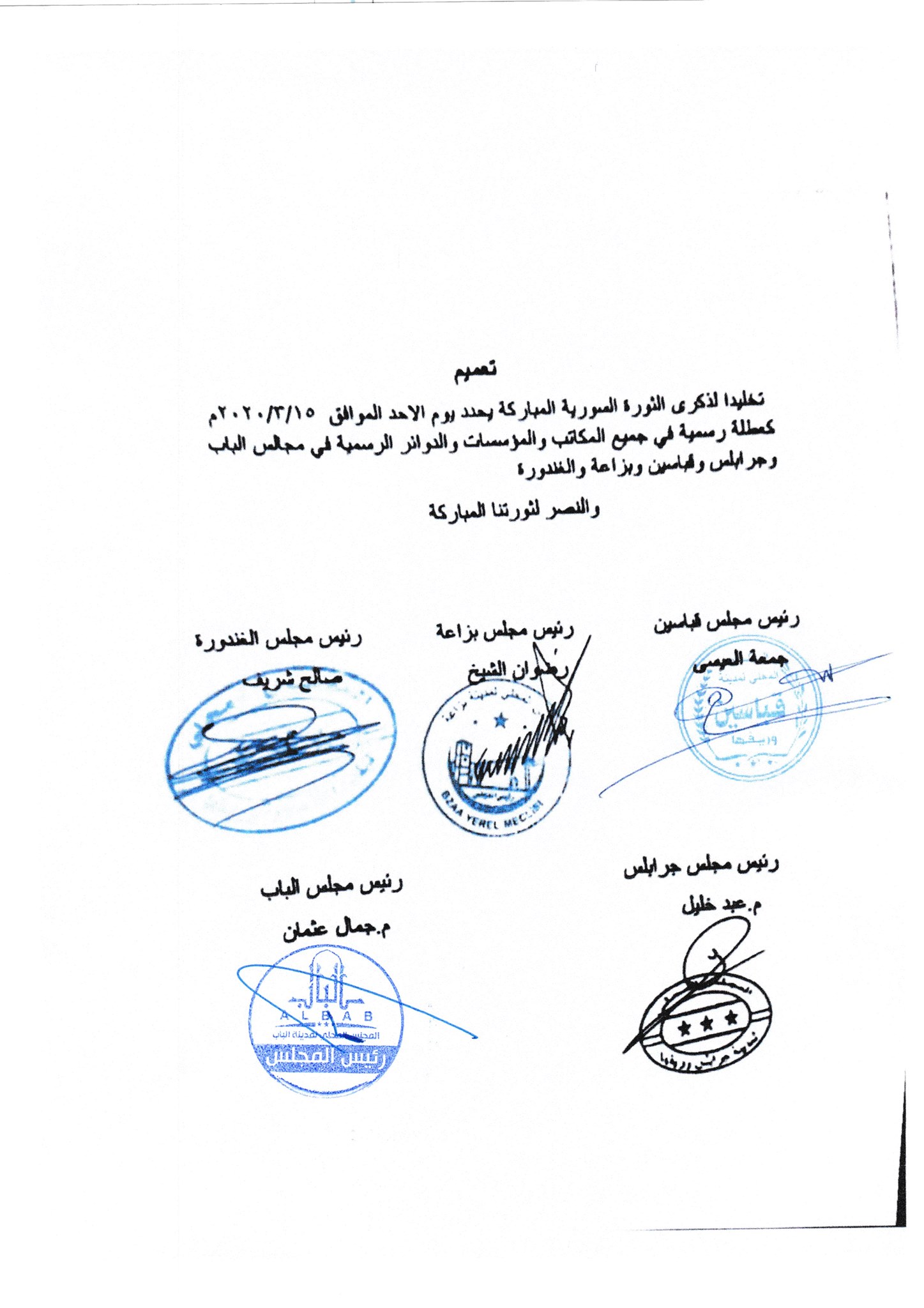تخليداً لذكرى الثورة السورية المباركة، يحدد يوم الأحد الموافق 15/03/2020 كعطلة رسمية في جميع المكاتب والمؤسسات والدوائر الرسمية في مجالس الباب وجرابلس وقباسين وبزاعة والغندورة.
