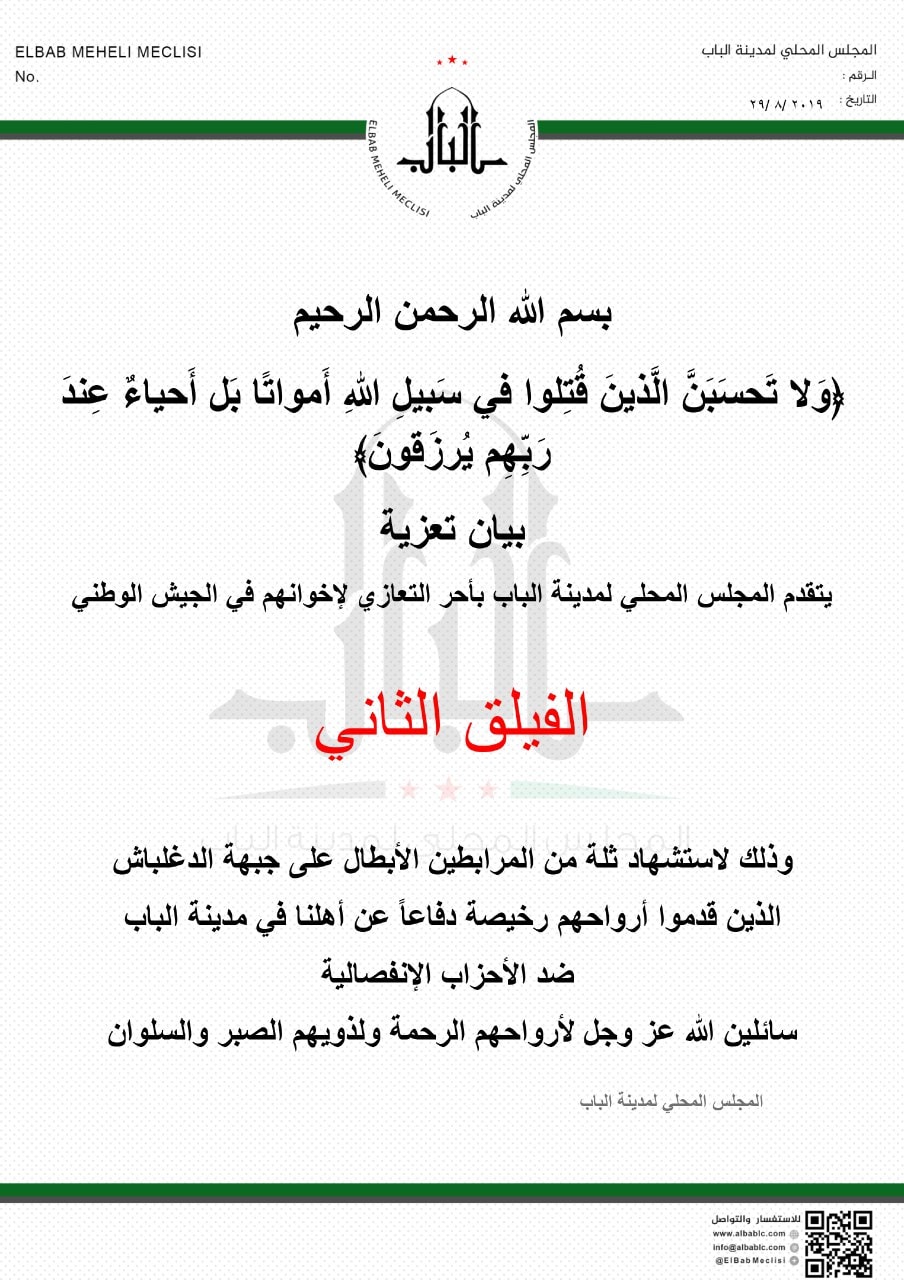 المجلس المحلي لمدينة الباب يعزي الفيلق الثاني بمجموعة من مقاتليه