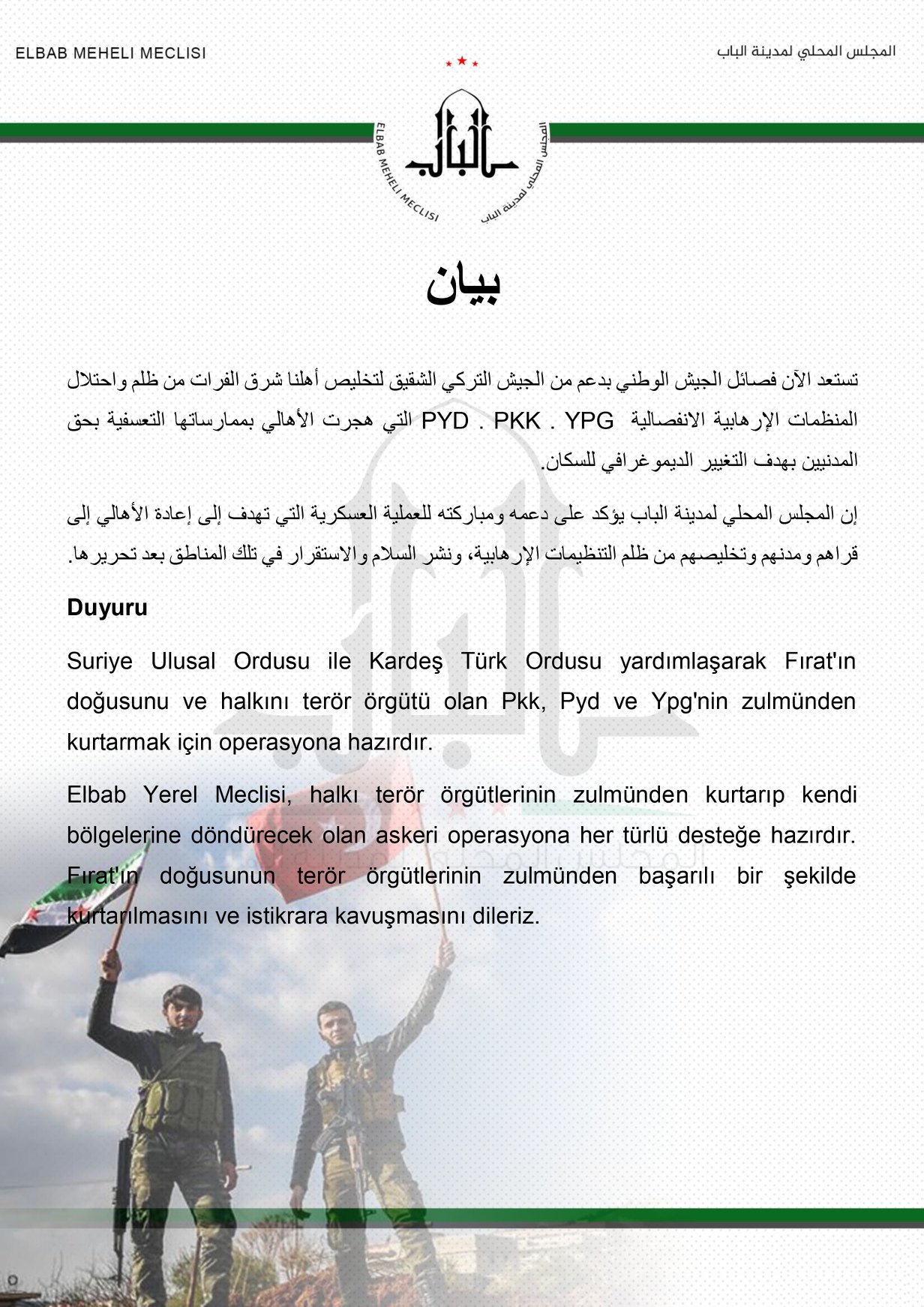 Elbab Yerel Meclisi, halkı terör örgütlerinin zulmünden kurtarıp kendi bölgelerine döndürecek olan askeri operasyona her türlü desteğe hazırdır. Fırat'ın doğusunun terör örgütlerinin zulmünden başarılı bir şekilde kurtarılmasını ve istikrara kavuşmasını dileriz.