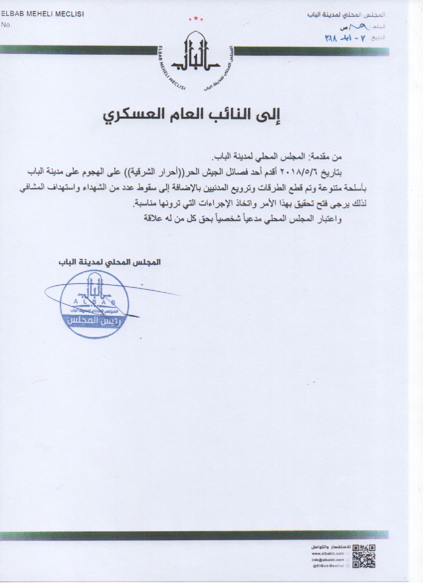 أقدم أحد فصائل الجيش الحر "أحرار الشرقية" على الهجوم على مدينة الباب بأسلحة متنوعة وتم قطع الطرقات وترويع المدنيين بالإضافة إلى سقوط عدد من الشهداء واستهداف المشافي لذلك يرجى فتح تحقيق بهذا الأمر واتخاذ الاجراءات التي ترونها مناسبة