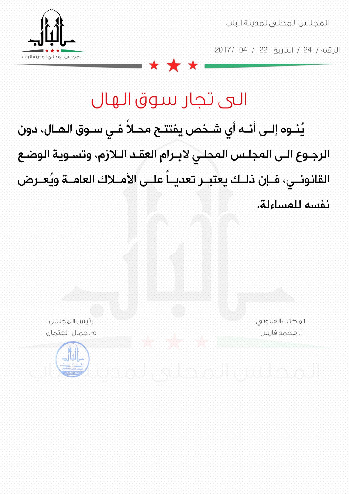 يُنوه #المجلس_المحلي لمدينة #الباب إلى أنه أي شخص يفتتح محلاً في سوق الهال، دون الرجوع الى المجلس المحلي لابرام العقد اللازم وتسوية الوضع القانوني، فإن ذلك يعتبرتعدياً على الأملاك العامة ويُعرض نفسه للمساءلة.