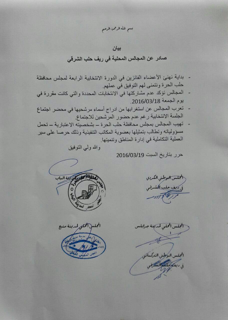 بيان صادر عن المجالس المحلية في ريف حلب الشرقي تعقيباً على انتخابات مجلس محافظة حلب الحرة