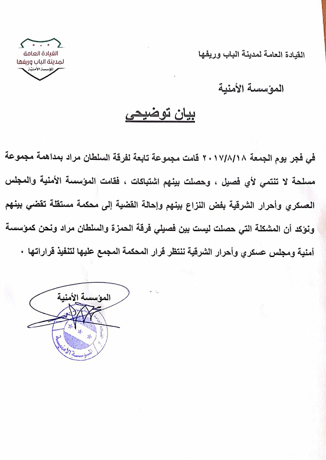 بيان توضيحي من القيادة العامة حول الإشتباك الذي حصل بين فرقة السطان مراد وإحدى المجموعات المسلحة