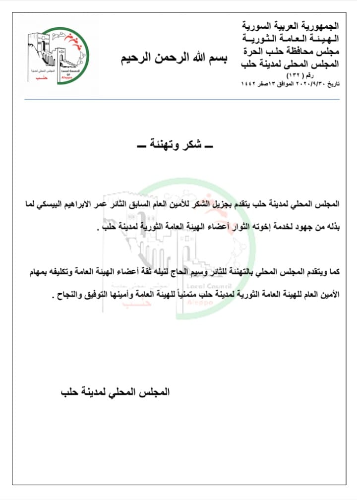 المجلس المحلي لمدينة حلب يهنئ وسيم الحاج على نيله الثقة لتولي منصب الأمين العام للهيئة العامة الثورية لمدينة حلب