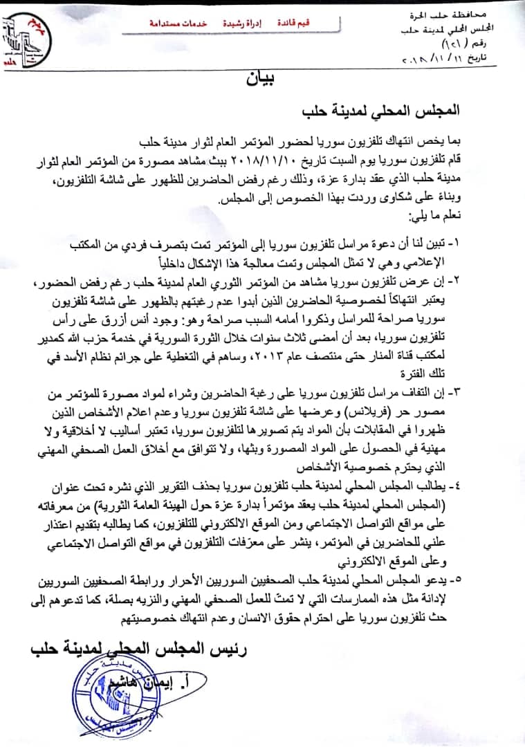 بيان حول انتهاك تلفزيون سوريا لحضور المؤتمر العام لثوار مدينة حلب
