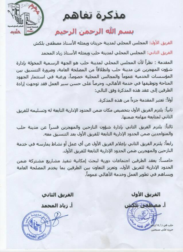 بيان بخصوص مذكرة التفاهم التي وقعت بين المجلس المحلي لمدينة حلب ومجلس مدينة حريتان حول إدارة شؤون المهجرين