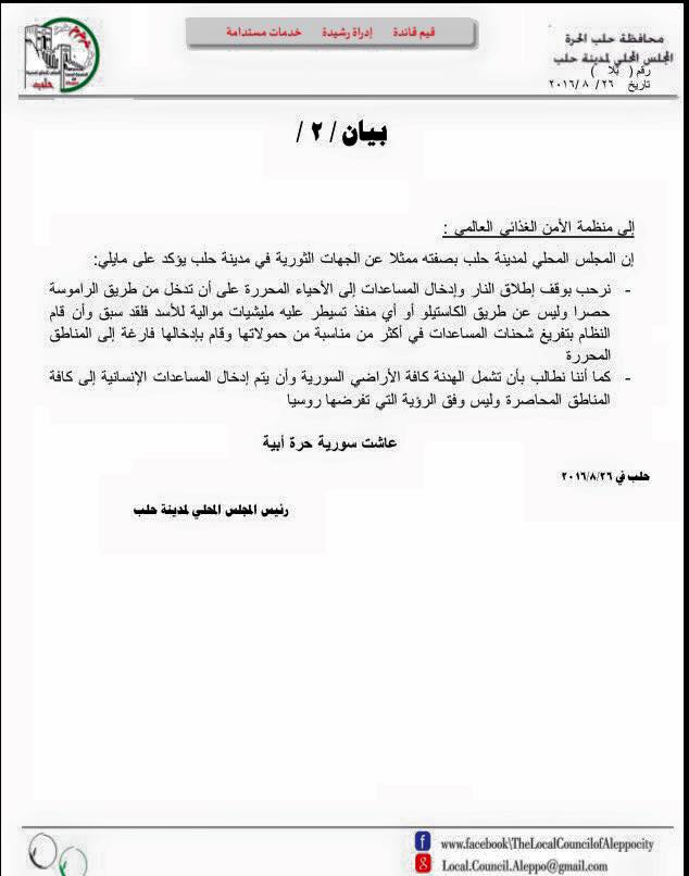 Announcement 2The Local Council of Aleppo City, being the representative of the revolutionary bodies in Aleppo stresses the following:- We welcome the seize fire and enter humanitarian aid to the liberated neighborhoods provided that they enter through Al Ramouseh Road only and not through the Castillo Road or any other any other passages controlled by the pro-Assad militia. The Regime has previously unloaded the aid trucks several times and entered them empty to the liberated areas.- We demand that this truce include all the Syrian territories and that humanitarian aid shall enter all besieged areas not only according to what the Russians impose upon us.Long live Free SyriaHead of Aleppo City Local Counciيان / 2 /